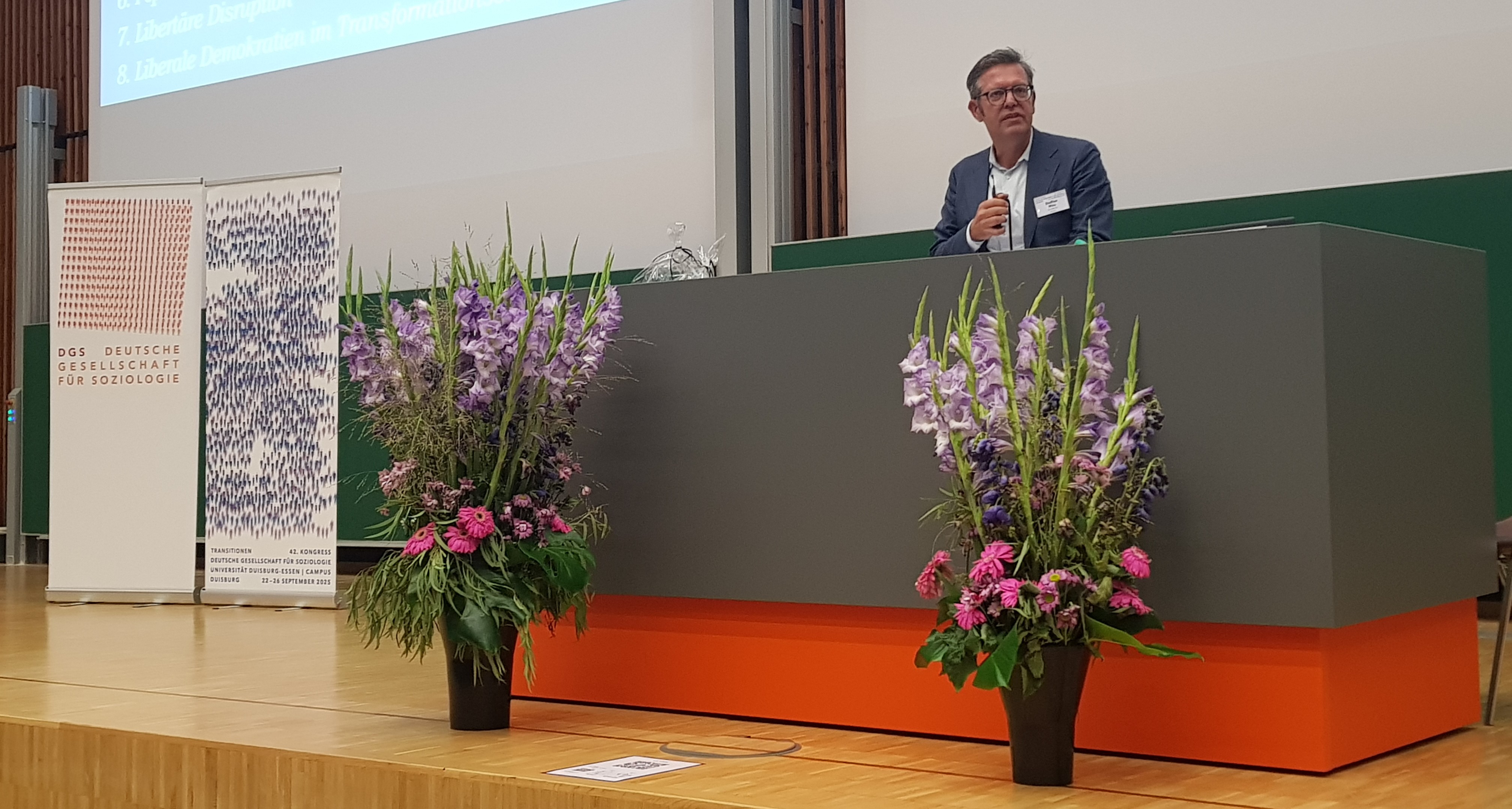 Ob nun der Zufall oder die kluge Regie dafür gesorgt hatte, der Duisburger Abschlussvortrag des Berliner Soziologen Steffen Mau schlug eine Brücke zwischen beiden Themen, zwischen Transitionen und Zukünften. Zuvor war Mau mit dem Preis für hervorragende Leistungen auf dem Gebiet der öffentlichen Wirksamkeit der Soziologie (kurz: mit dem Öffentlichkeitspreis) ausgezeichnet worden. Da seine Laudatorin Nicole Burzan nicht nach Duisburg kommen konnte, übernahm Uta Karstein die, wie sie selbst sagte, Rolle des Mediums und verlas die Lobrede, in der die beeindruckende Reihe von Büchern gewürdigt wurde, mit denen Steffen Mau die Entwicklung des Fachs geprägt und zugleich eine große Öffentlichkeit gesellschaftsanalytisch aufgeklärt hat: Lebenschancen. Wohin driftet die Mittelschicht? (2012), Das metrische Wir. Über die Quantifizierung des Sozialen (2017), Lütten Klein. Leben in der ostdeutschen Transformationsgesellschaft (2019), Sortiermaschinen. Die Neuerfindung der Grenze im 21. Jahrhundert (2021), Triggerpunkte. Konsens und Konflikt in der Gegenwartsgesellschaft (gemeinsam mit Linus Westheuser und Thomas Lux, 2023), Ungleich vereint. Warum der Osten anders bleibt (2024). Mau, so hieß es, gelinge immer wieder der Balanceakt zwischen innerwissenschaftlichen Standards und außerwissenschaftlichen Erwartungen, zwischen Differenziertheit und Zuspitzung. Dabei argumentiere er stets sachlich und unaufgeregt.
